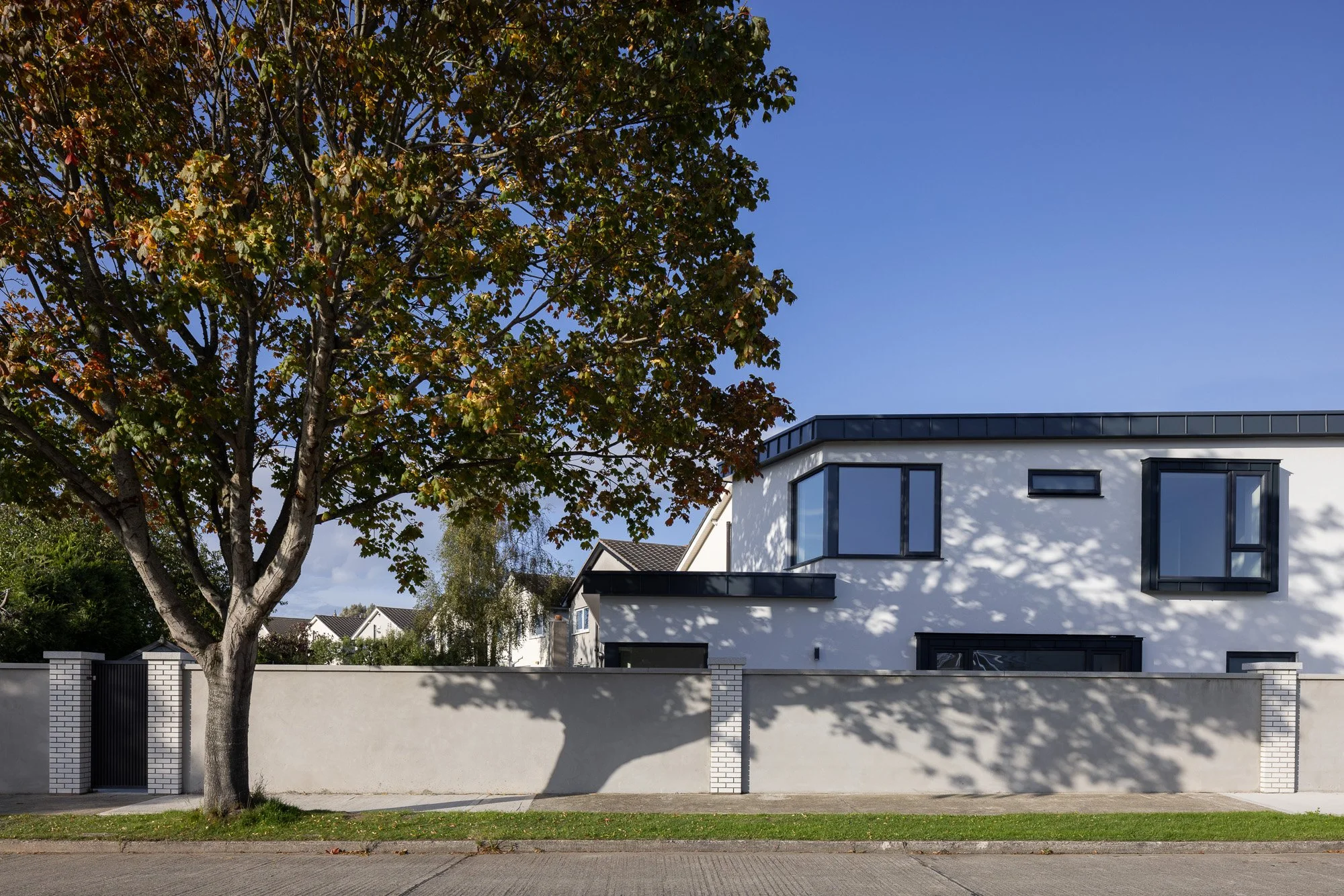 The client wanted to build a new house on the site of his existing home. The design is a response to the tapering site which necessitated a butterfly roof to accommodate the irregular floor plan of the building. Projecting windows and corner windows punctuate the elevations and take advantage of the corner site.